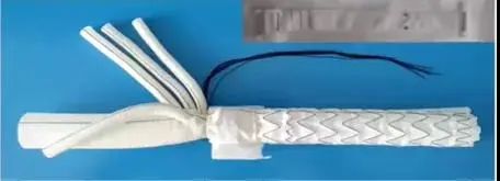 一體化免縫合帶支架人工血管系統(tǒng)包括人工血管和免縫合扣帶兩部分,通過主動脈覆膜支架進行腔內修復,一般由股動脈導入,到達病變部位后釋放支架,支架撐開后固定在主動脈內壁,將病變血管覆蓋,重建安全通路,恢復血流循環(huán)。