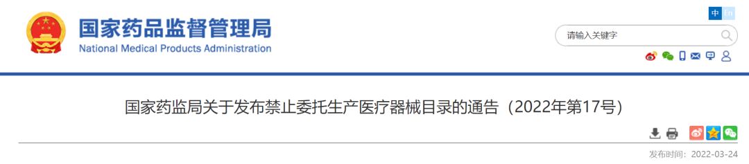 為加強醫(yī)療器械生產(chǎn)監(jiān)管,保障醫(yī)療器械安全、有效,根據(jù)《醫(yī)療器械監(jiān)督管理條例》(國務(wù)院令第739號),國家藥品監(jiān)督管理局組織修訂了《禁止委托生產(chǎn)醫(yī)療器械目錄》,現(xiàn)予發(fā)布,自2022年5月1日起施行,原國家食品藥品監(jiān)督管理總局《關(guān)于發(fā)布禁止委托生產(chǎn)醫(yī)療器械目錄的通告》(2014年第18號)同時廢止。特此通告。