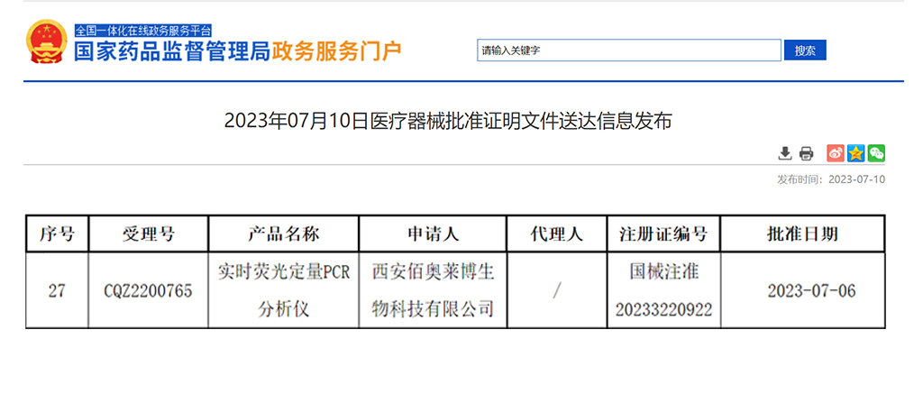 2023年7月6日,經(jīng)國家藥品監(jiān)督管理局公示,西安佰奧萊博生物科技有限公司的“實時熒光定量PCR分析儀”(國械注準(zhǔn)20233220922)獲得NMPA批準(zhǔn)上市,系2023年奧泰康助力獲得的第11張三類醫(yī)療器械注冊證。