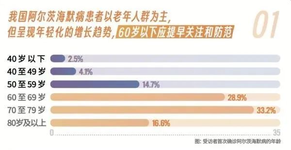 數(shù)據(jù)表明,首次確診阿爾茨海默病的人群中,年齡在60至79歲之間的人群占比最高,為62.1%。但值得注意的是,60歲以下的阿爾茨海默病發(fā)病患者在本次調(diào)查中占到了21.3%,相比國際上報(bào)道的早發(fā)型阿爾茨海默病占比5-10%更多,表明阿爾茨海默病在我國發(fā)病越來越年輕化。由于這類罹患人群尚處工作年齡,需要引起全社會(huì)的高度重視,強(qiáng)化全人群健康教育,加強(qiáng)疾病預(yù)防、早期篩查和診斷。