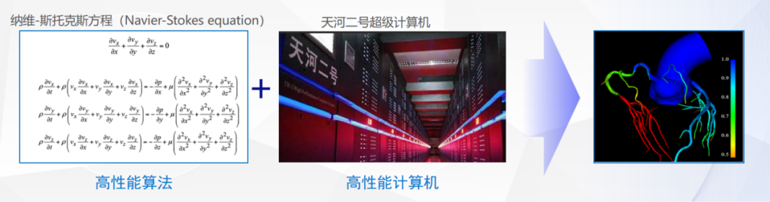 眾所周知, FFR是心肌缺血評價的“金標準”,是臨床判斷是否對冠心病患者施血管內(nèi)干預(yù)治療的主要依據(jù)。傳統(tǒng)方法是通過有創(chuàng)方法獲得,近年來隨著計算機技術(shù)的迅速發(fā)展,基于CT的無創(chuàng)FFR測量技術(shù)(即FFRCT)得到了快速發(fā)展。該技術(shù)起源于美國HeartFlow公司,其基本原理是基于常規(guī)CCTA所獲得的冠狀動脈三維圖像,采用流體力學(xué)方程(納維斯托克斯方程)在高性能計算機(超級計算機)上進行流體力學(xué)仿真計算,獲得冠狀動脈內(nèi)血流動力學(xué)參數(shù),例如血壓、血流速度、血流量等,進而得到血流儲備分數(shù)(FFR)(圖2)。