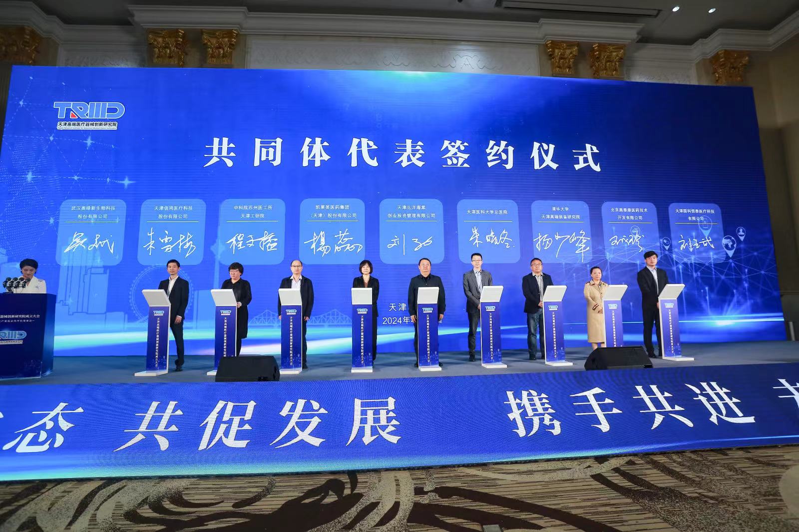 2024年4月24日,由天津市市場監(jiān)督管理委員會、天津市藥監(jiān)局、天津市科技局、天津市衛(wèi)健委、天津市教委、天津市醫(yī)保局和東麗區(qū)區(qū)委區(qū)政府牽頭籌辦的天津高端醫(yī)療器械創(chuàng)新研究院成立大會暨創(chuàng)新轉化產(chǎn)業(yè)化公共平臺發(fā)布會于天津順利舉行。奧泰康集團副總王成珍女士受邀參加成立大會,并出席天津高端醫(yī)療器械創(chuàng)新研究院共同體代表簽約儀式。