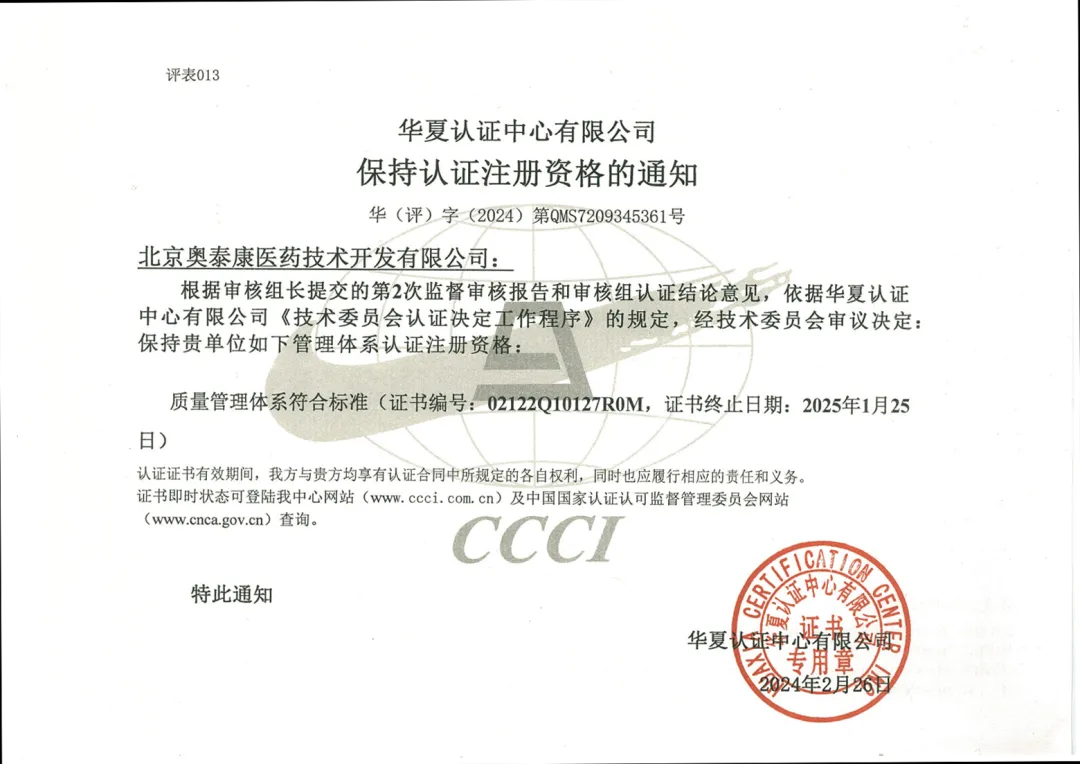 2024年3月,北京奧泰康醫(yī)藥技術開發(fā)有限公司經(jīng)華夏認證中心有限公司(CCCI)認證,順利通過ISO9001:2015 標準質(zhì)量管理體系認證年度審核,認證范圍為醫(yī)療器械臨床試驗及產(chǎn)品注冊服務。嚴格的質(zhì)量管理體系是企業(yè)持續(xù)、穩(wěn)定、健康發(fā)展的根本保證,通過ISO9001認證標志著我司的醫(yī)療器械臨床試驗及產(chǎn)品注冊服務與管理體系已達到了國際標準、行業(yè)標準,在制度化、體系化和標準化方面取得了里程碑式的進展。