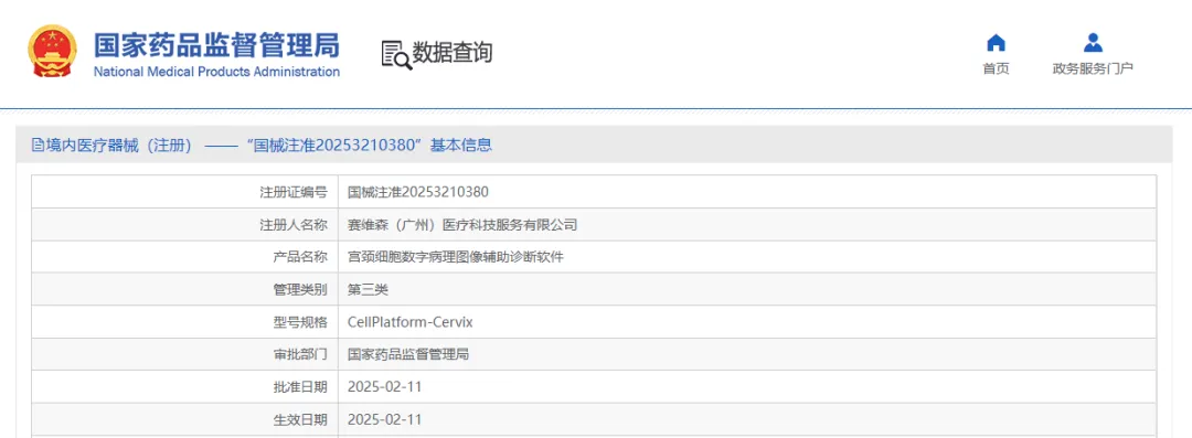賽維森科技自主研發(fā)的“宮頸細胞數(shù)字病理圖像輔助診斷軟件”,正式獲得國家藥監(jiān)局(NMPA)頒發(fā)的第三類醫(yī)療器械注冊證,是宮頸細胞學領(lǐng)域首張“輔助診斷”三類證。人工智能正式升級為醫(yī)生的“超級助手”!(注冊證編號:國械注準20253210380)