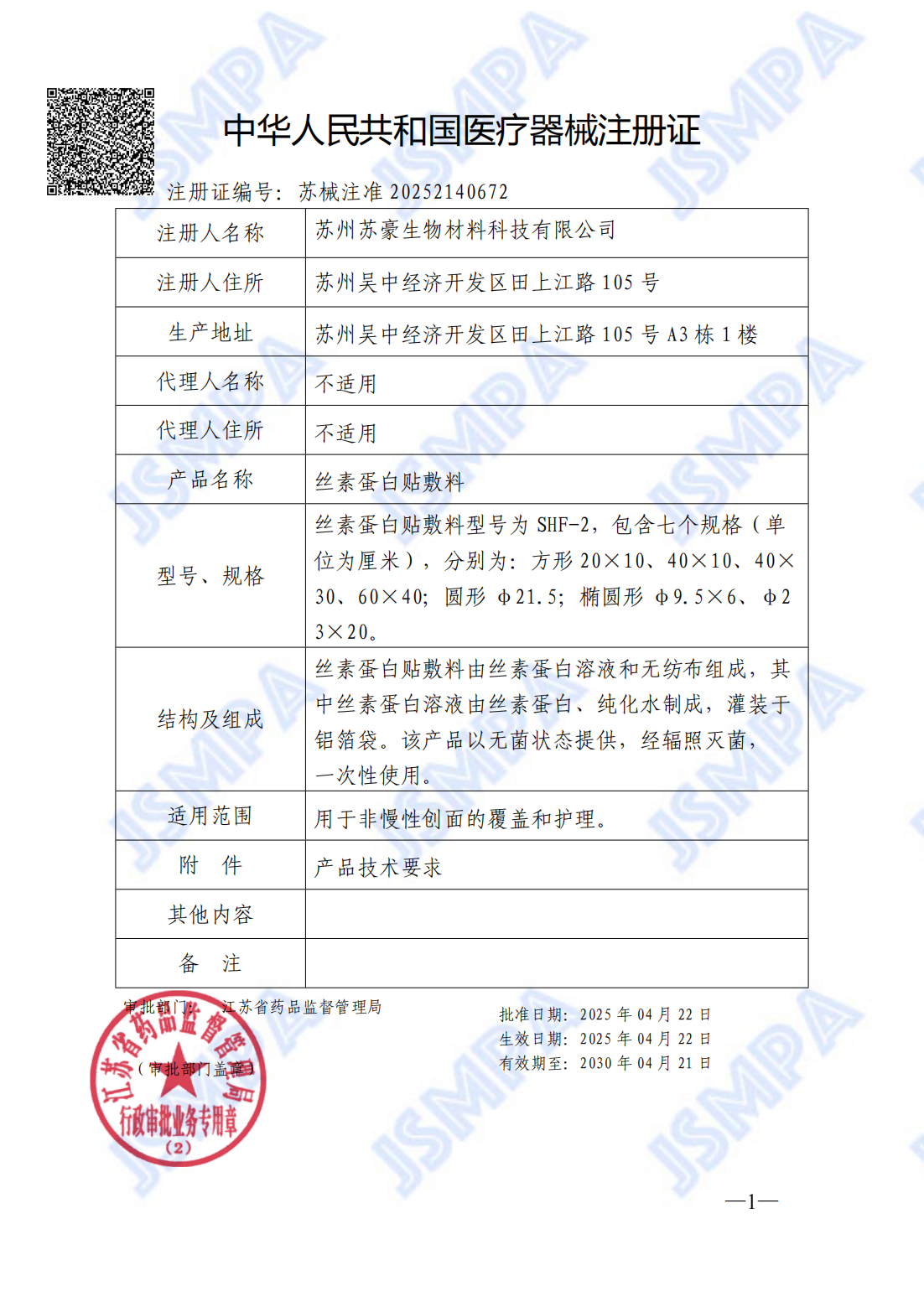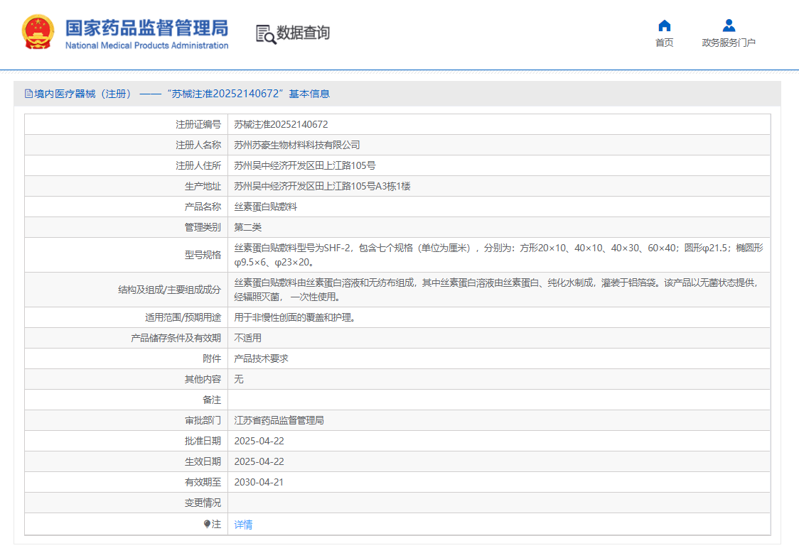 2025年4月22日,經(jīng)國(guó)家藥品監(jiān)督管理局公示,奧泰康蘇州CDMO中心研發(fā)的絲素蛋白貼敷料(蘇械注準(zhǔn)20252140672)獲得NMPA批準(zhǔn)上市,產(chǎn)品獲批國(guó)家第二類醫(yī)療器械注冊(cè)證。
