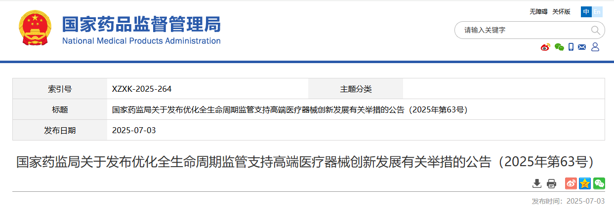 國家藥監(jiān)局關(guān)于發(fā)布優(yōu)化全生命周期監(jiān)管支持「高端醫(yī)療器械」創(chuàng)新發(fā)展有關(guān)舉措的公告(2025年第63號(hào))