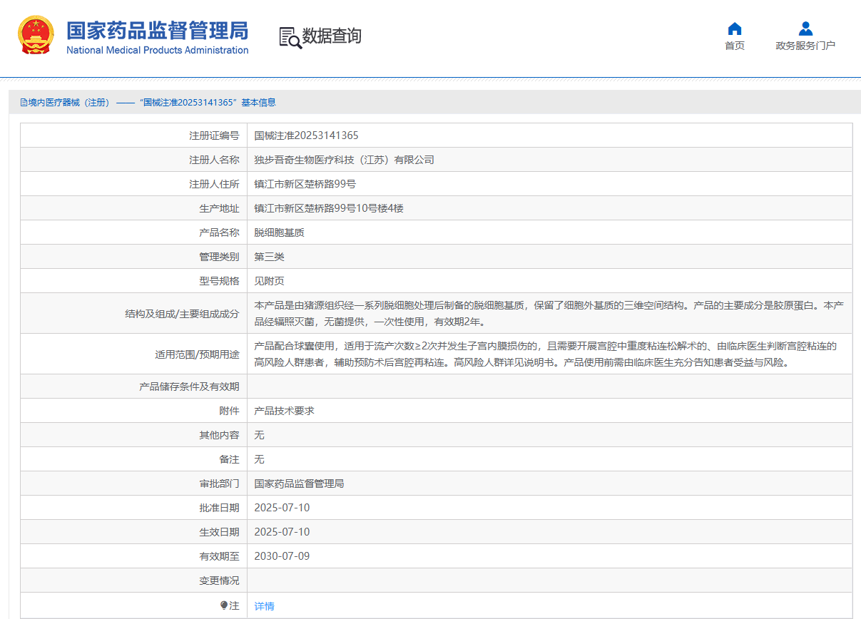 近期,經(jīng)國(guó)家藥品監(jiān)督管理局公示,獨(dú)步吾奇生物醫(yī)療科技(江蘇)有限公司自主研發(fā)的產(chǎn)品脫細(xì)胞基質(zhì)(國(guó)械注準(zhǔn)20253141365 )獲得NMPA批準(zhǔn)上市,奧泰康提供MA解決方案。